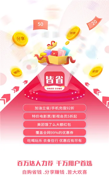 皆省app是网购省钱工具,有海量商品资源,设团购省钱攻略。界面简洁,操作流畅,定期更新商品信息与优惠券。新人专享优惠,百万补贴,全部包邮,还能领外卖红包,满足全场景购物需求。