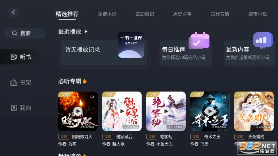 1. 海量资源:拥有大量优质图书资源,涵盖小说、历史、传记、文学、科幻等各大类别,十万小时作品,近二十个大类,全方位满足听书需求。