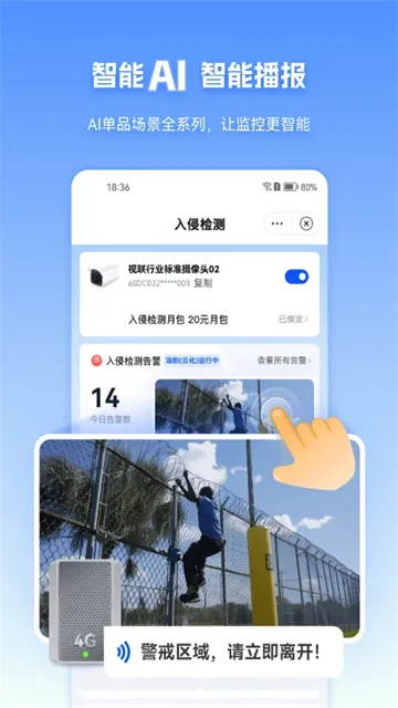 2. 智能AI助力:新增智能AI分析服务,如人脸识别、车牌识别等。监控点遇异常时,会通过邮件或短信发送报警通知,确保用户及时知晓。
