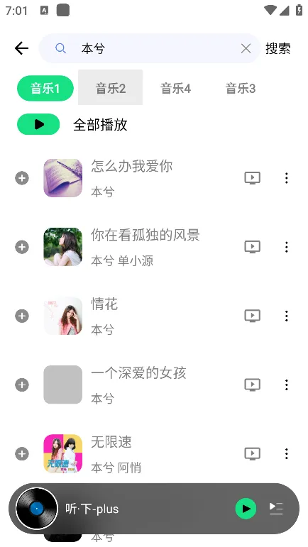 听下plus类似的音乐软件功能超强大!它能聚合各大音乐平台网站搜索接口,免费在线试听及下载版权音乐、全网付费歌曲,无损音质歌曲随便下。有十几个搜索渠道任你切换,输入歌名或者歌手,海量音频任你选。软件UI界面简约清新,采用插画设计。它提供在线播放以及缓存功能,还能同步收藏,跨平台无缝使用。不仅有独家内容、精选音乐,曲库最大最全,热歌新歌想听就听。而且能根据爱好搜索音乐,满足当代年轻人需求。下载歌曲超方便,在搜索栏输入想听的歌,选好音质就能耐心等待下载完成。还能轻松管理下载的音乐,更改下载路径。没有烦人的广告,给你纯净的听歌体验,让你随时随地享受音乐,尽情畅游在音乐的海洋。