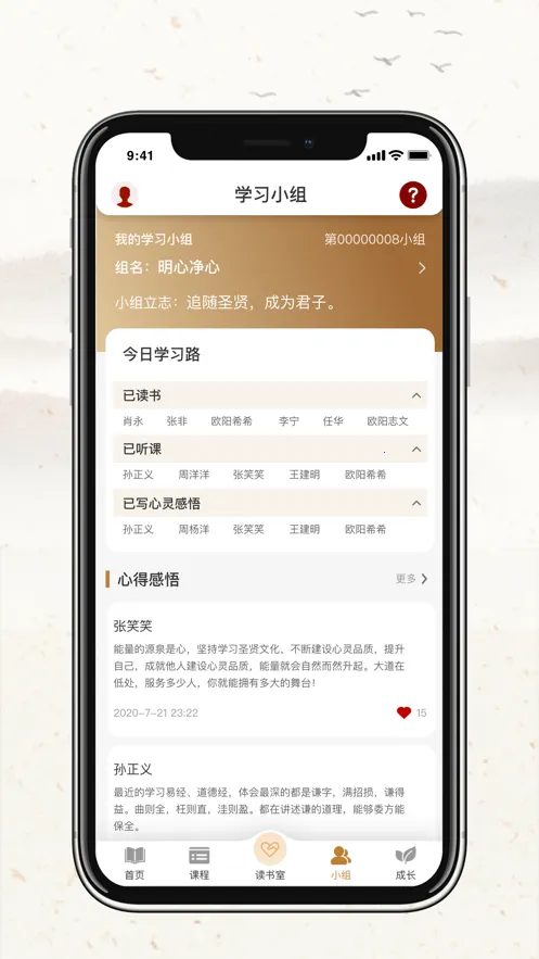 2. 促进习惯养成:通过碎片化学习降低门槛,借助每日更新课程和千万人学习小组,帮助人们保持学习热情,养成明心净心的思维习惯。
