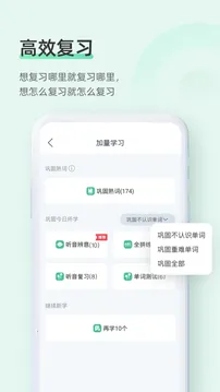 2. 智能制定学习计划,按遗忘曲线和学习进度确定单词熟悉度,自动安排复习时间和频率,还提供多种加强单词记忆的功能。