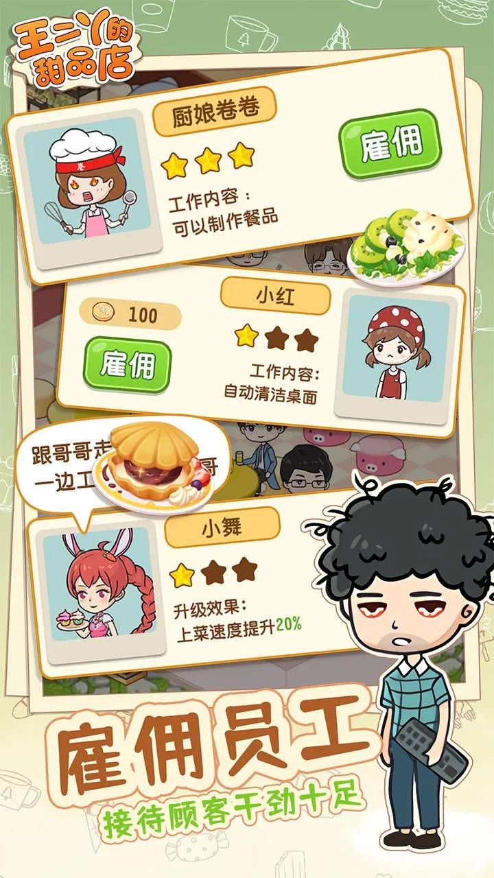在童话般的卡通小镇,化身王二丫经营甜品店。这是款模拟经营游戏,融合美食创作、员工管理、心动社交与随机奇遇。有清新画风、丰富场景,能制作多款甜品,节奏舒缓,自由定义成长路径,享受经营乐趣。